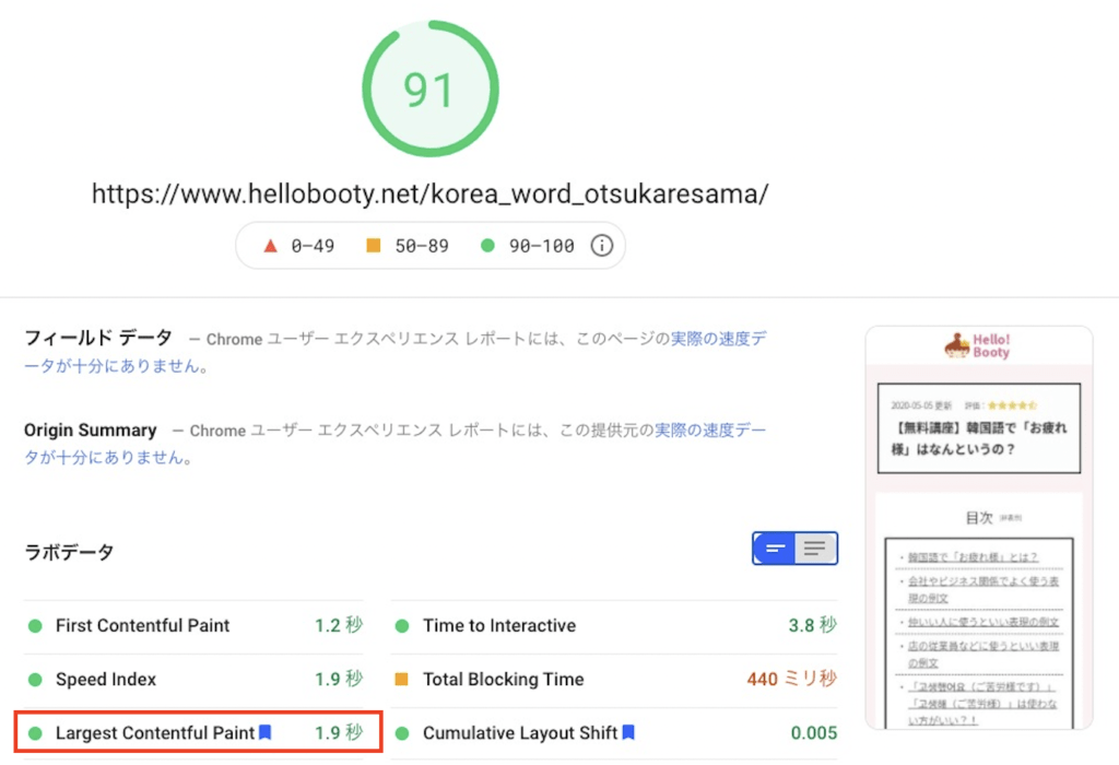 LCPが1.9秒になりました!しかも点数も91点まで上がってます!