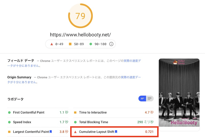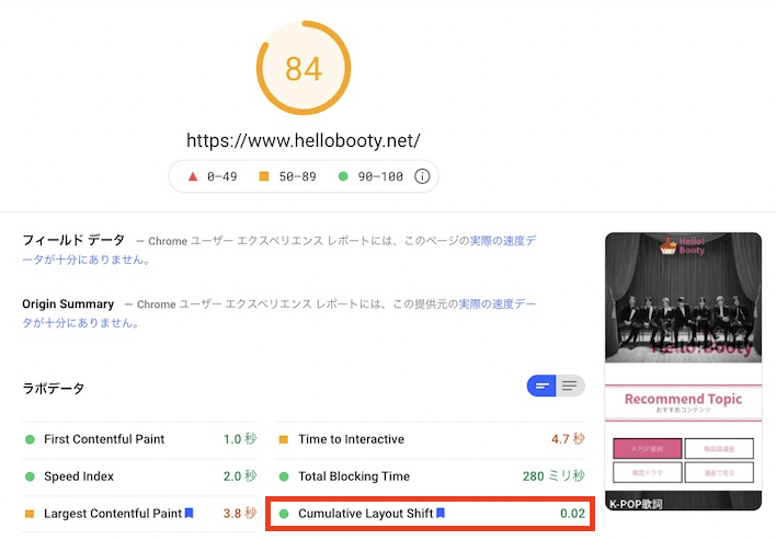 CLSが0.02に大きく改善できました!そしてLCPと同じくページスピード点数も上がってます。