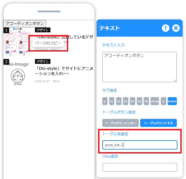 - 「パーツIDコピー」をクリックして、パーツIDをコピーし、「トーグル先指定」にパーツIDを貼り付け