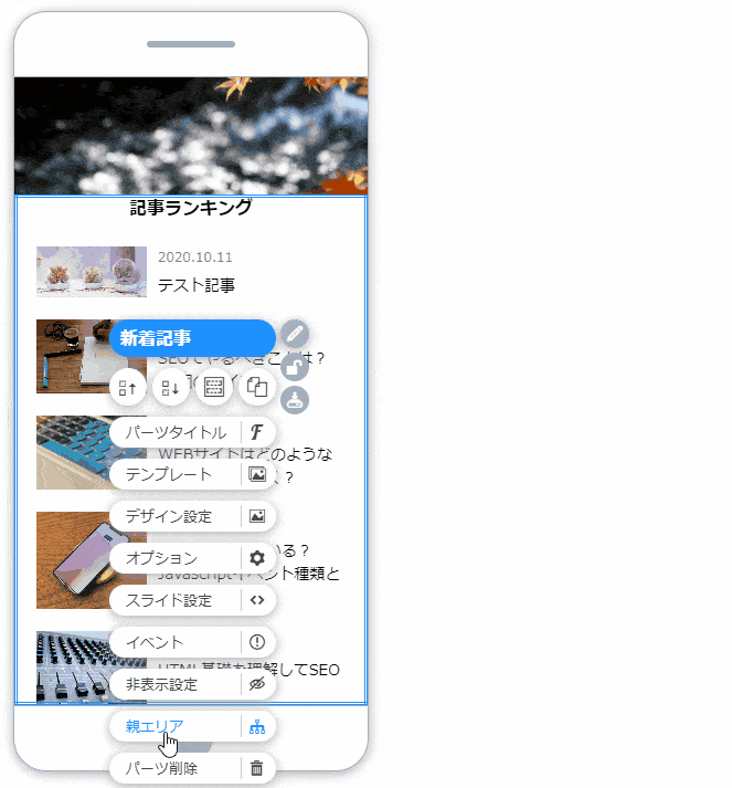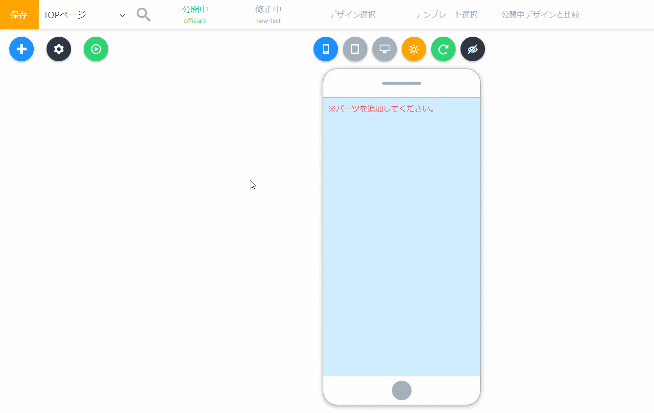 1. 「パーツ追加」より「エリア」を追加します。