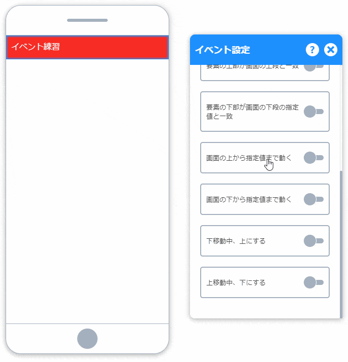 - 設定したいイベントをONにする(例は画面の上から指定値まで動く)