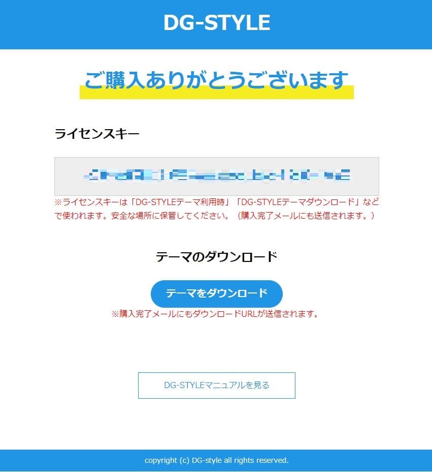 テーマはPaypalの支払いが終わって、完了ページからテーマの「ライセンスキー」と「ダウンロードURL」が取得できます。(Paypalで登録したメールアドレスにも同じ情報が送信されます。)