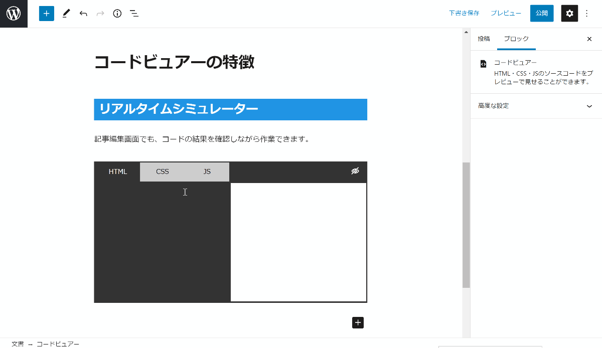 HTML・CSS・JSのコードをシミュレーター実際の動きを見せることができるブロックです。