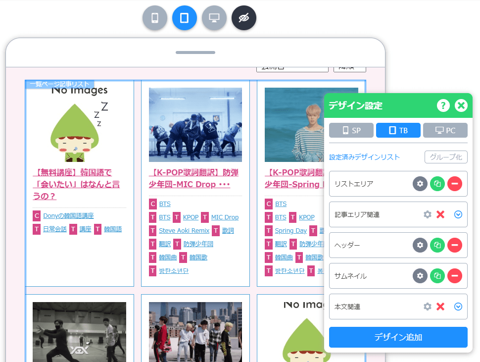 - デバイスを「TB(タブレット)」に変更して、デザインを作成