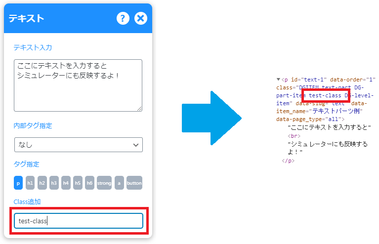 テキストパーツに指定した文字列をClassとして追加することができます。半角スペースで区切ることで、複数のClassが追加できます。