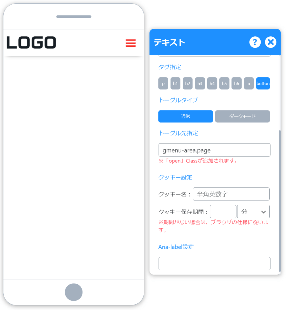 buttonタグは、ボタンをクリックすることで、指定先のパーツに「open」Classを追加/削除ができる機能です。