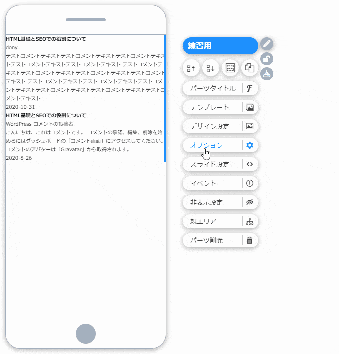 各パーツ専用のオプションメニューを開きます。上で詳しく説明しています。