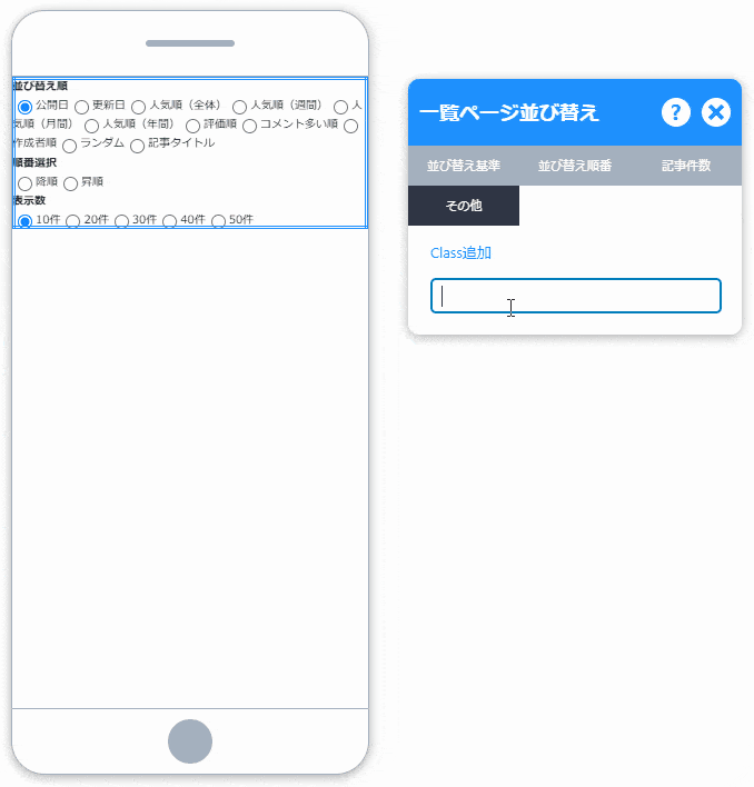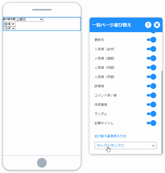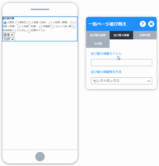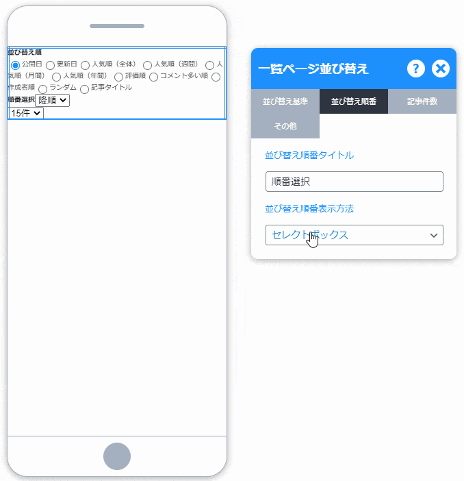 1. 「並び替え順番表示方法」より、「セレクトボックス」か「ラジオボタン」を選択