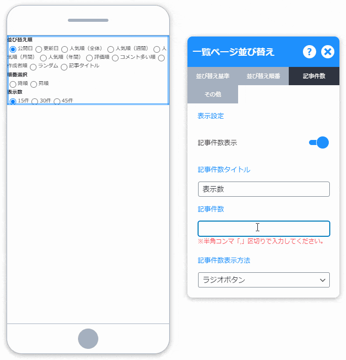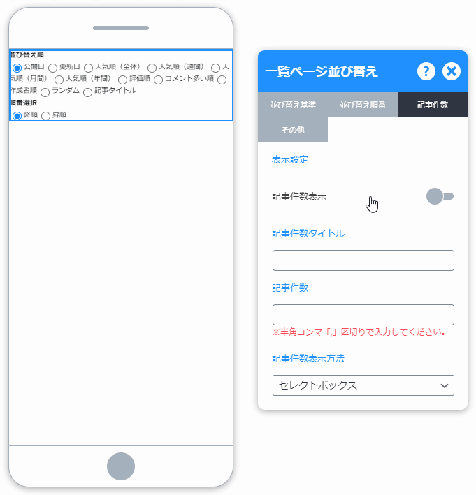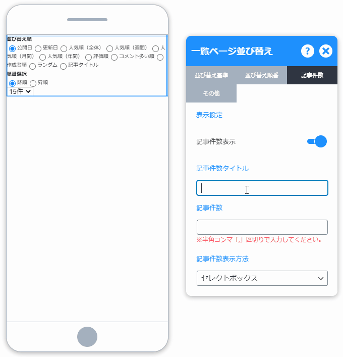 1. 「記事件数」で表示させたい件数を設定(半角数字のみ)