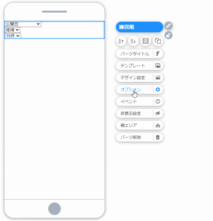 1. パーツ追加から「一覧ページ並び替え」を選択