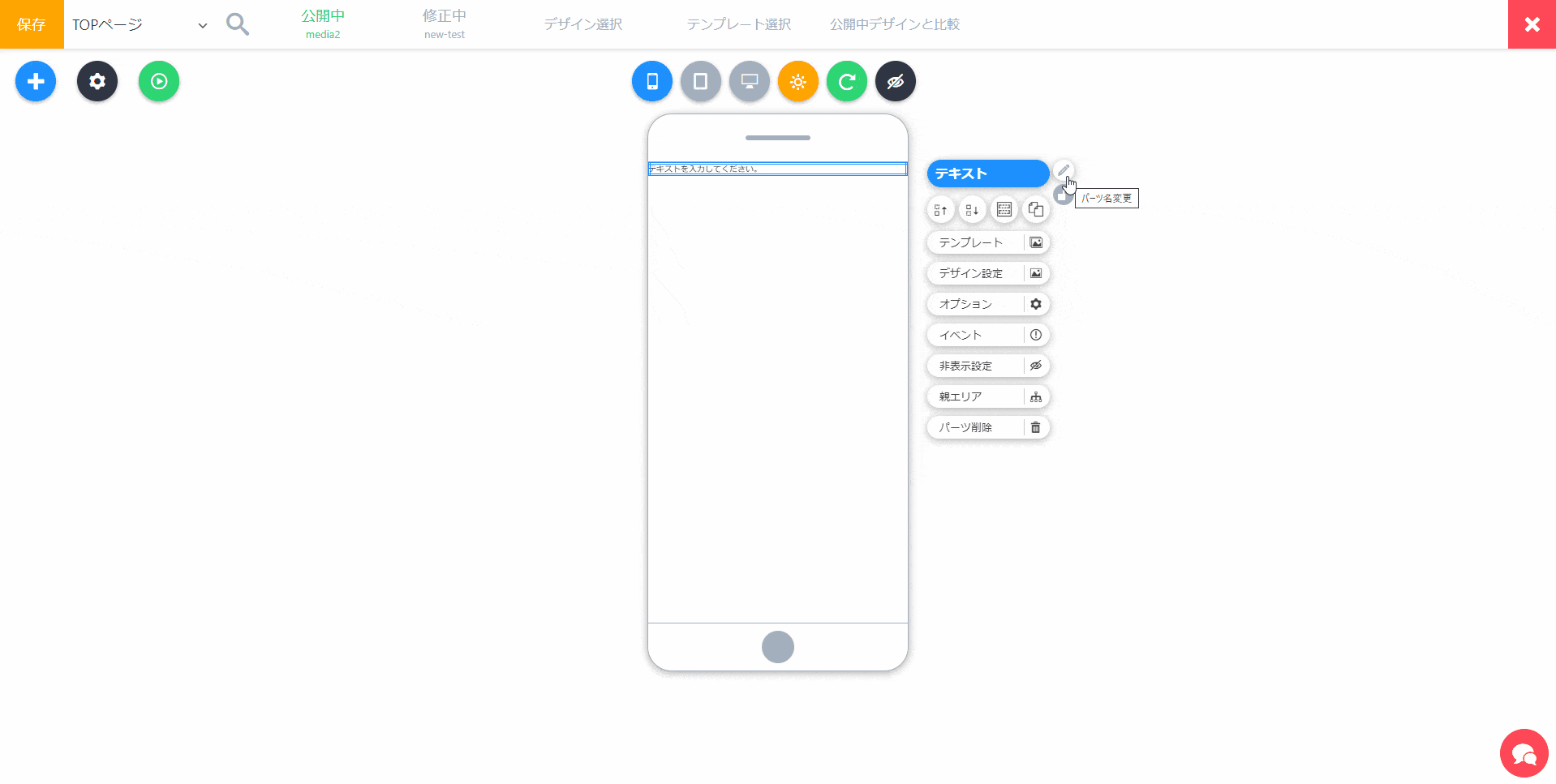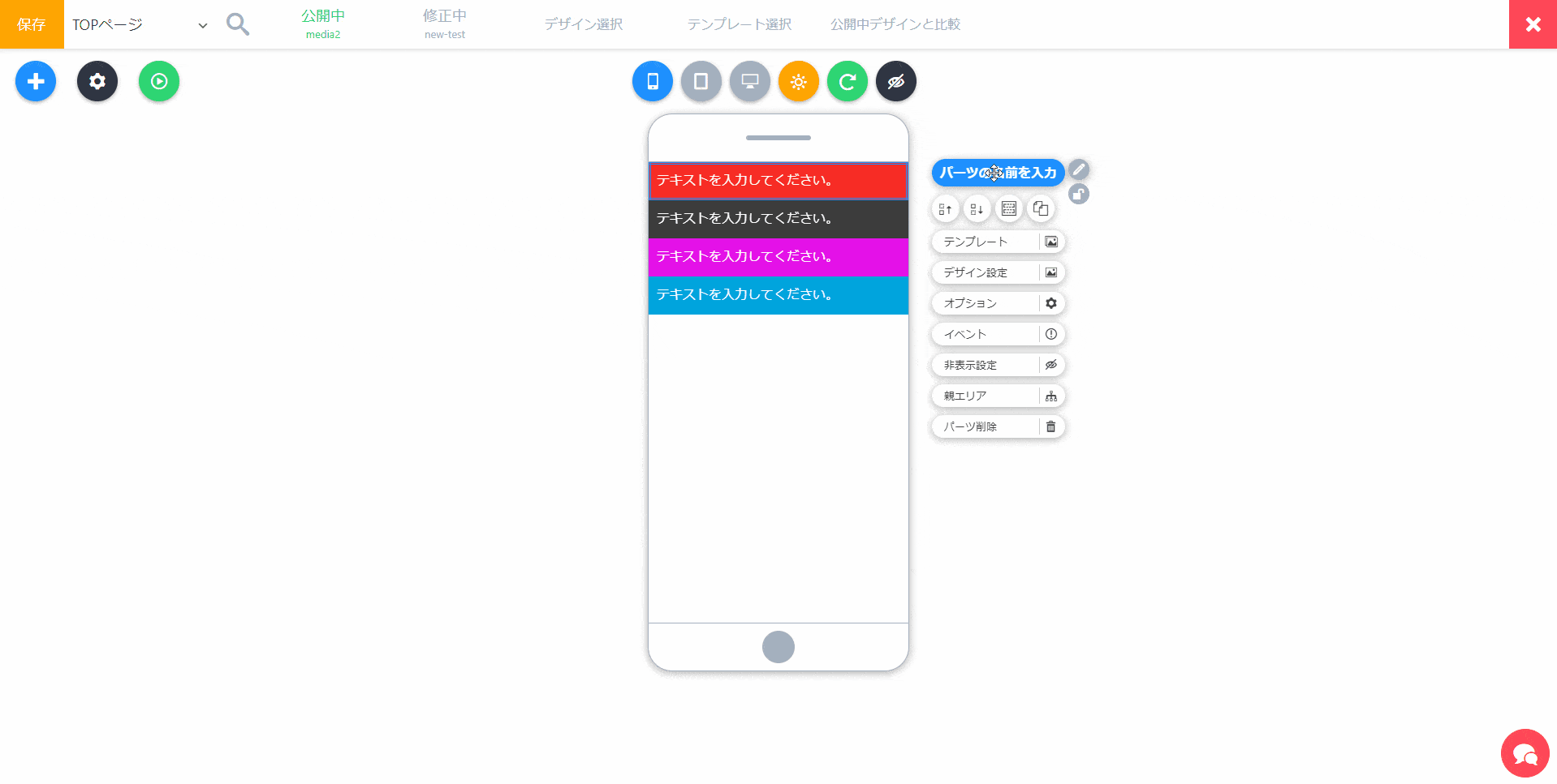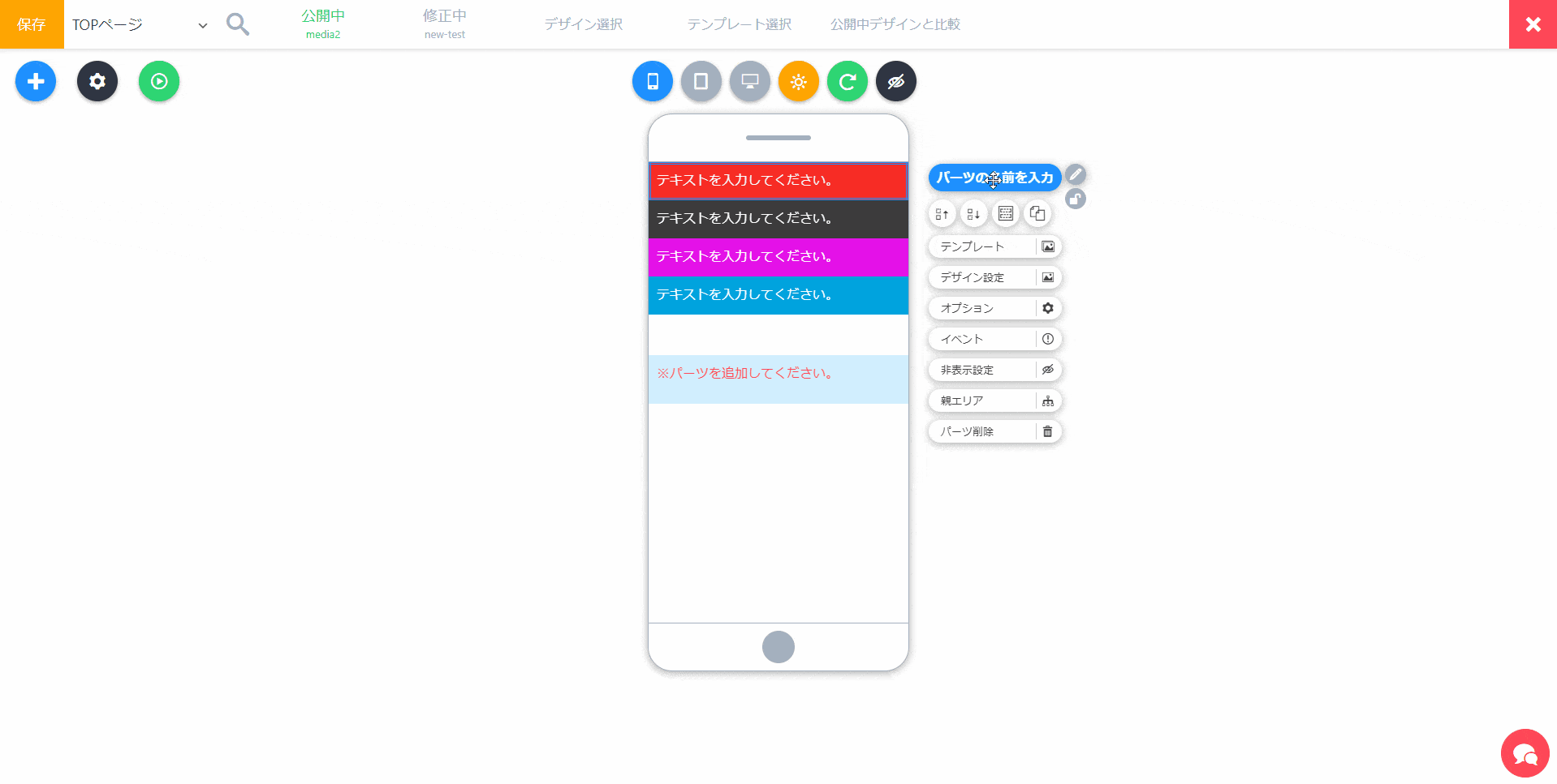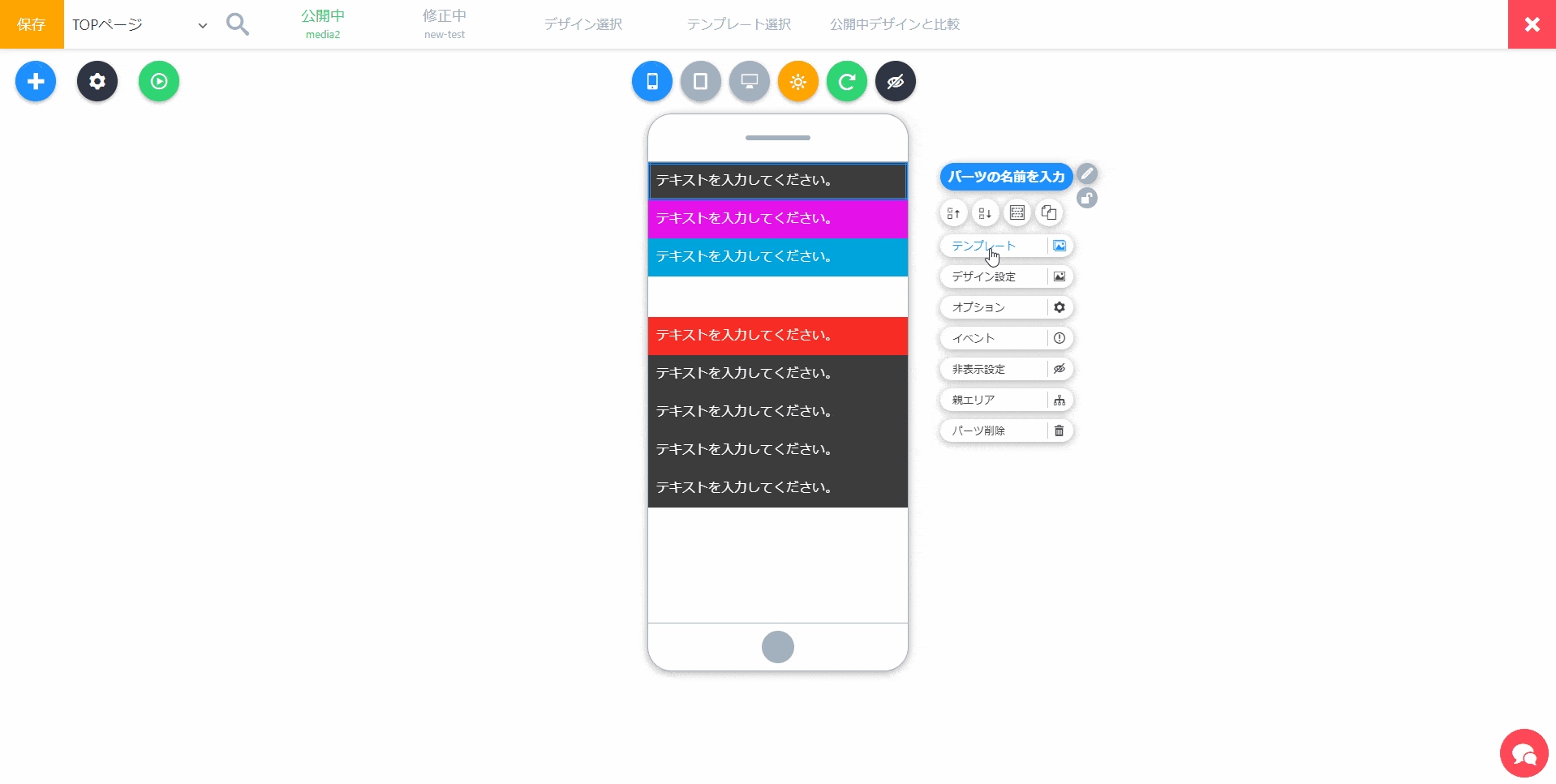 1クリックで、パーツのデザインを変えられるテンプレートメニューを開きます。簡単にデザインを変えたい場合に使います。