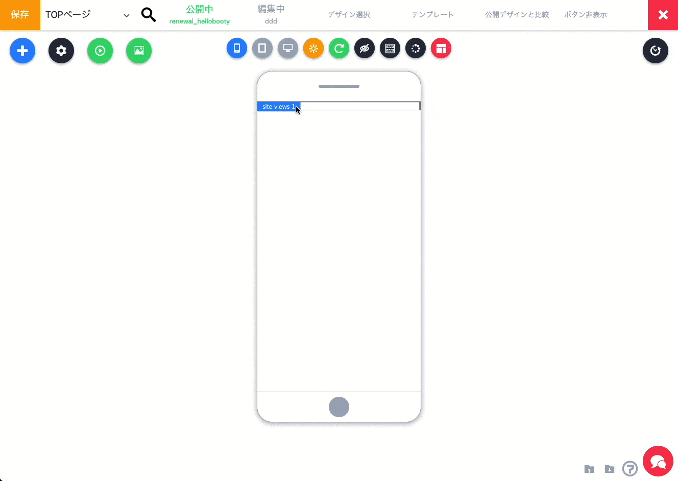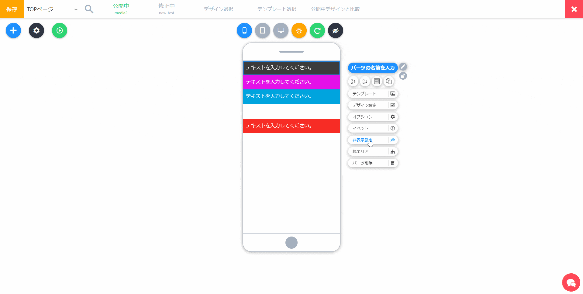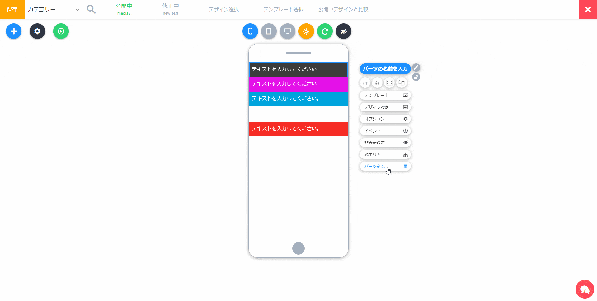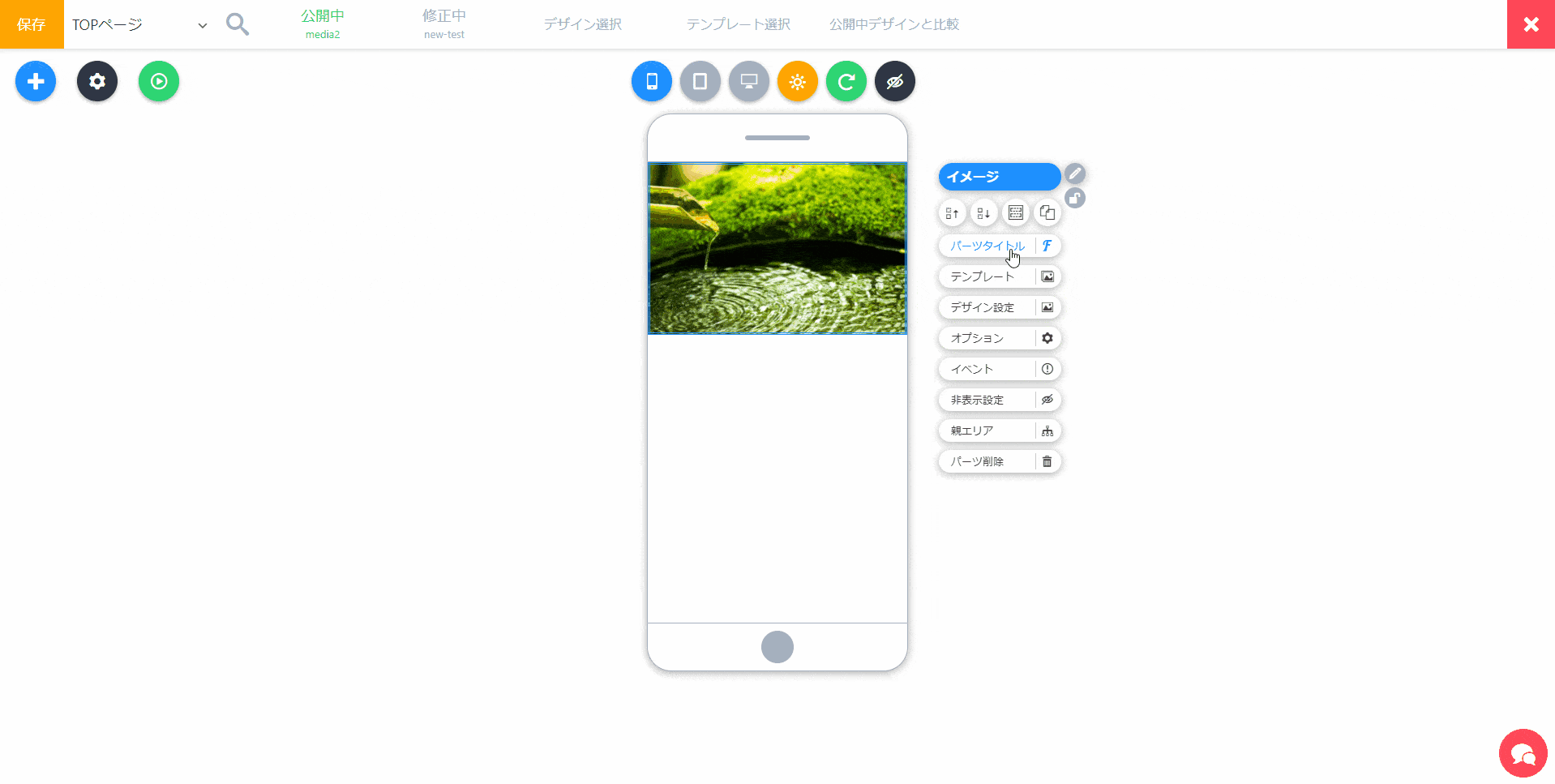 1クリックで、パーツのデザインを変えられるテンプレートメニューを開きます。簡単にデザインを変えたい場合に使います。