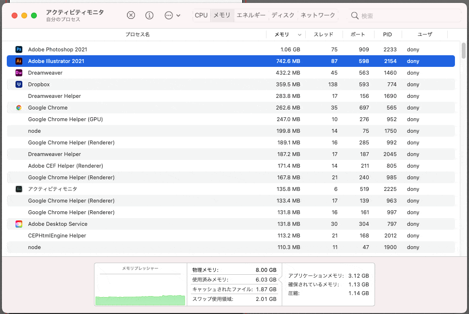 またAdobeのDreamweaver、Photoshop、Illustrator、DropBoxを全部開いた場合は、6GBくらいメモリを使用しました。