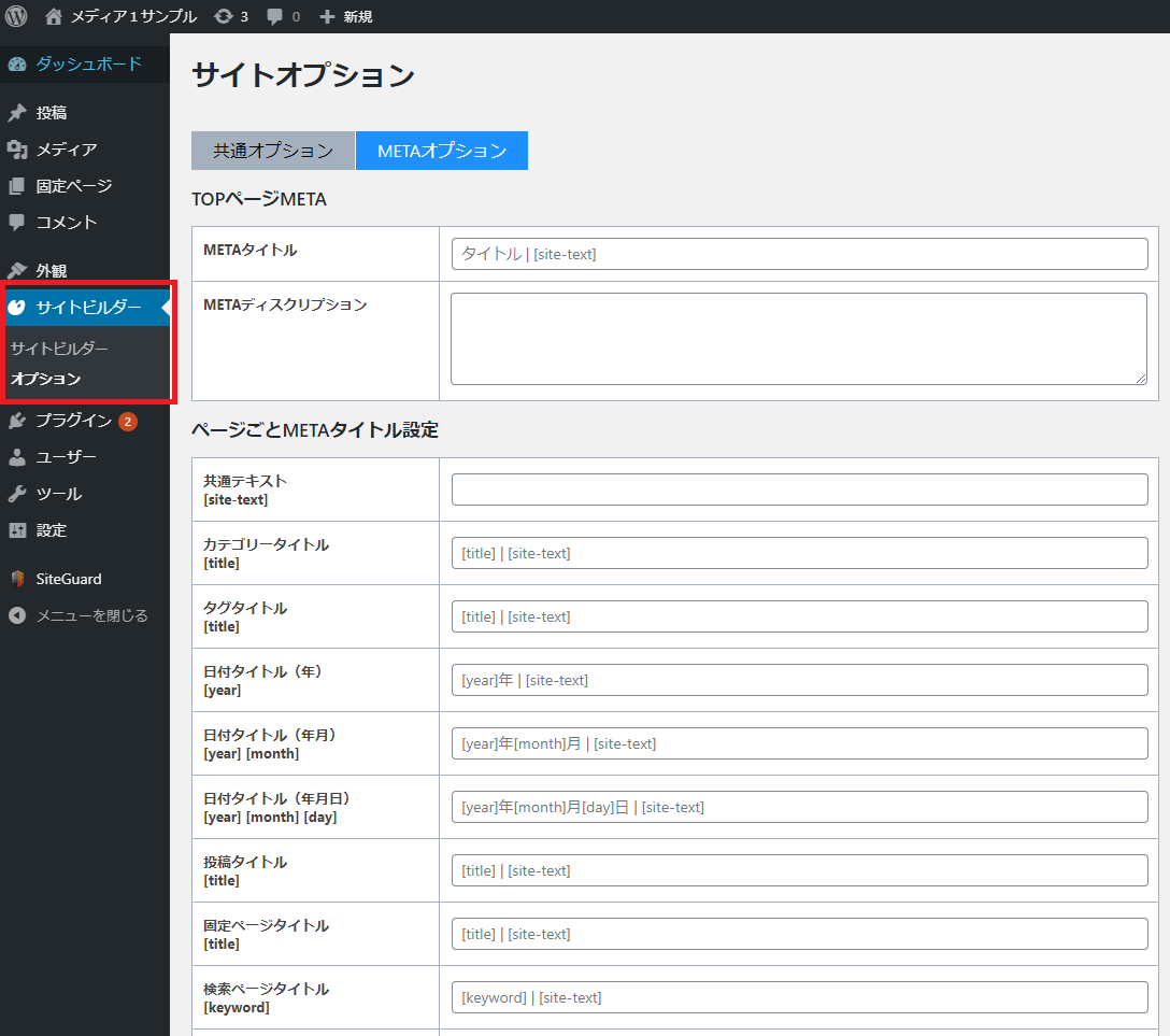 - WordPress管理画面の左メニューから「サイトビルダー」の「オプション」を選択