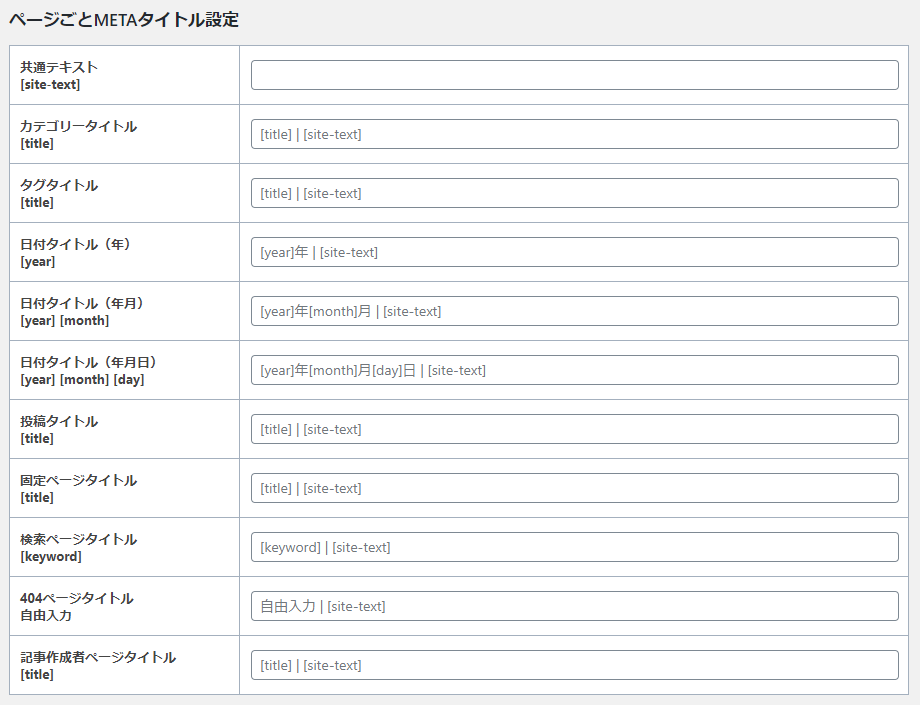 また「共通テキスト」に入れた文字は、他のタイトルに[site-text]を入れることで、何度も同じ文字を書かなくても反映できます。