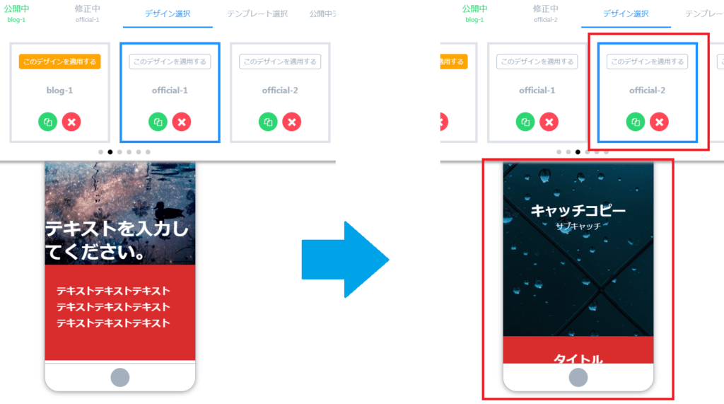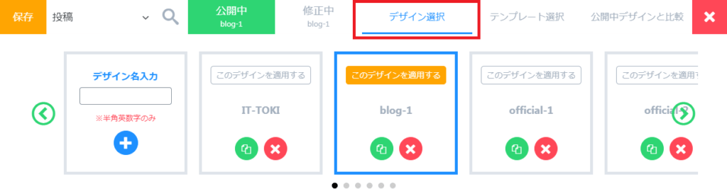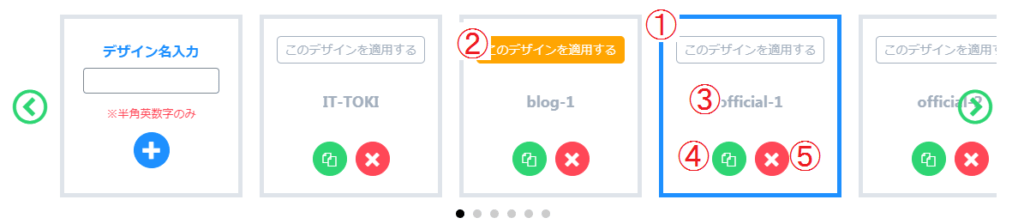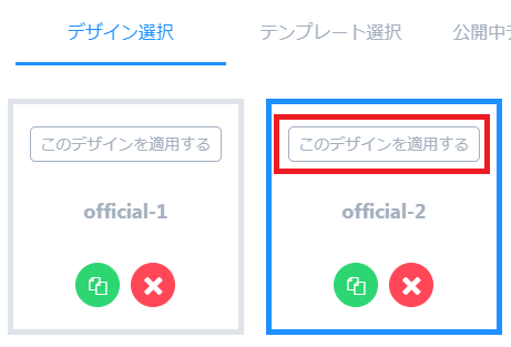 - 適用ボタン:現在公開中デザイン(オレンジ)/適用する(グレー)