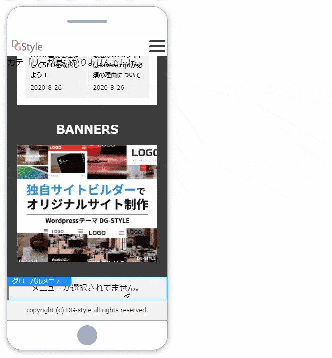 - 「メニュー選択」から、WP管理画面で登録したメニューを選択する