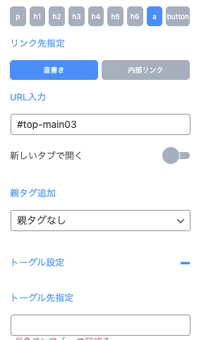 「テキスト」と「イメージ」パーツで、「aタグ」の場合でもトーグル設定ができるように追加しました。