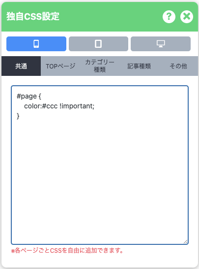 専門家の場合、パーツを個別に設定することが面倒だという意見がありましたので、独自CSSを追加できる機能を追加しました。