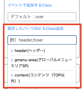 イベント設定の「指定したパーツIDにもClass追加」で、現在のパーツリストを表示するように設定しました。